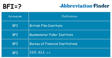 While the British Film Institute is the most common and well-known meaning of BFI , it’s worth noting that the abbreviation can sometimes stand for other things, depending on the context. Here are a couple of other possibilities:
