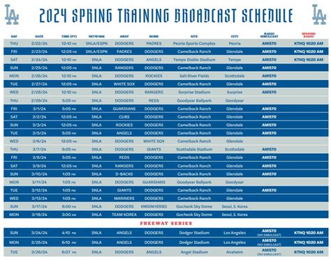 • Official Dodgers Website: The best and most reliable source is the official Dodgers website. They will usually have a downloadable and printable version of the schedule available. Keep an eye out on their spring training section as the season approaches, and you’ll find it there. This is typically the first place to look. The Dodgers website provides detailed information, including game times, opponents, and venue details. Having the schedule from the official source ensures you have the most up-to-date information, avoiding any confusion or missed games. The official website is often updated with any changes, so it is the best source for accurate information. This includes details on special events, promotions, and player appearances during spring training. Plus, you can often find useful links to purchase tickets, parking information, and directions to Camelback Ranch. The official website also provides insights into the team’s activities during spring training. You might find interviews with players and coaches, videos of practice sessions, and behind-the-scenes content that enriches your experience. So, checking the Dodgers website regularly is essential for any fan wanting to stay fully informed and enjoy the spring training season to the fullest. You will be able to easily find the printable schedule and access other valuable resources. It’s your one-stop shop for all things Dodgers spring training.