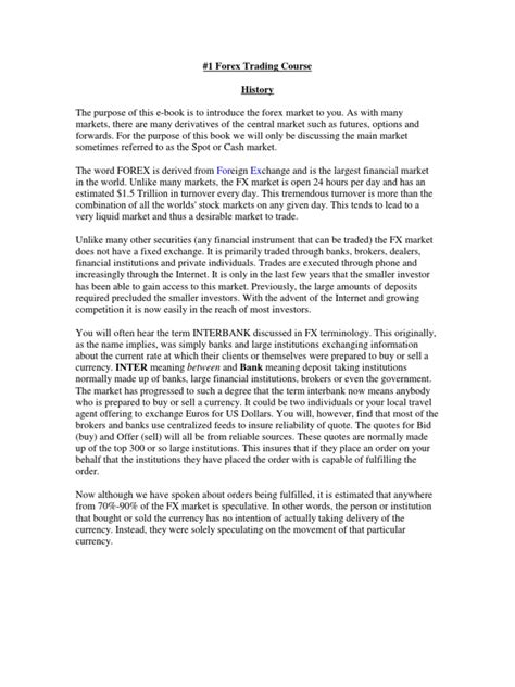 Alright, let’s get down to business with the core of what we’re talking about: the forex market . Before you even think about downloading a full course PDF for free , it’s vital to understand what you’re getting into. The forex market is massive, decentralized, and operates 24 hours a day, five days a week. This means you can trade almost anytime, which is pretty cool, but also means you need to be aware of different market sessions (like the London, New York, and Asian sessions) and how they impact currency prices. So, what exactly happens in forex trading? Simply put, you’re buying one currency while simultaneously selling another. For example, if you think the Euro will strengthen against the US Dollar, you’d buy EUR/USD. If you’re right, the value of your Euro increases relative to the dollar, and you make a profit. If you’re wrong, you lose money. This fundamental concept is the bedrock of all forex trading, and a good free forex trading course PDF will explain this in depth, often using relatable examples. You’ll learn about currency pairs, like majors (EUR/USD, GBP/USD, USD/JPY), minors, and exotics. Understanding these pairs is key because their movements are influenced by a myriad of factors. These include economic indicators (like GDP, inflation, employment data), interest rates set by central banks, political stability, and even global news events. For instance, a sudden political crisis in a country can cause its currency to plummet, creating trading opportunities (and risks!). Forex trading isn’t just about guessing; it’s about analyzing these factors to make informed decisions. A comprehensive free course should cover macroeconomic analysis, teaching you how to read economic calendars and understand the impact of economic news releases. It should also delve into how central bank policies, such as interest rate hikes or cuts, can significantly affect currency valuations. You’ll also encounter terms like pips (the smallest unit of price movement), leverage (borrowing capital from your broker to trade larger positions, which amplifies both potential profits and losses – use with extreme caution! ), and margin (the deposit required to open and maintain a leveraged position). Grasping these concepts is non-negotiable for anyone serious about trading forex . A well-structured PDF course will break down these complex ideas into digestible chunks, ensuring that even beginners in South Africa can start building a strong foundational understanding. Remember, the more you understand the mechanics and driving forces behind the forex market, the better equipped you’ll be to navigate its complexities and identify potential trading opportunities. This initial phase of education is paramount; it’s the blueprint upon which all your future trading strategies will be built. Don’t skip this part, guys!