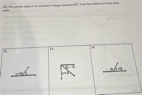 Our specific problem states that we have an isosceles triangle where the vertical angle (also known as the vertex angle) is 50 degrees. The vertex angle is the angle formed by the two equal sides of the isosceles triangle. Our mission is to find the measure of the other two angles, which are the base angles.
