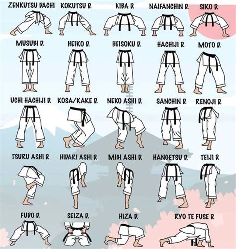 Alright, let’s dive into the nitty-gritty of karate stances. Stances are the foundation of all karate techniques. They provide the stability, power, and balance you need to execute strikes, blocks, and movements effectively. Mastering these basic stances is crucial for any beginner. Think of them as the alphabet of karate – you need to know them inside and out before you can start forming words and sentences. The first stance you’ll encounter is the Heisoku Dachi (Attention Stance) . This is your starting point for many exercises. Stand with your feet together, heels and toes touching, and your hands relaxed at your sides. Maintain a straight posture and focus your gaze forward. This stance emphasizes proper alignment and mental readiness. Next up is Musubi Dachi (Open-Toe Stance) . Similar to Heisoku Dachi, but with your heels together and your toes pointing outwards at a 45-degree angle. This stance is often used for bowing and showing respect. Then we have Heiko Dachi (Parallel Stance) . Stand with your feet shoulder-width apart and parallel to each other. This stance provides a stable base for various movements and is commonly used in kata (forms). Now, let’s move on to more dynamic stances. Zenkutsu Dachi (Front Stance) is a fundamental stance used in many karate styles. Step forward with one leg, bending your front knee to a 90-degree angle and keeping your back leg straight. Your weight should be distributed evenly between both legs. This stance is crucial for generating power in your strikes. Another important stance is Kokutsu Dachi (Back Stance) . In this stance, most of your weight is on your back leg (around 70%), with your front leg bent slightly for balance. This stance is often used for defensive techniques and evasive maneuvers. Lastly, we have Kiba Dachi (Horse-Riding Stance) . Stand with your feet wider than shoulder-width apart, and bend your knees as if you were sitting on a horse. Keep your back straight and your core engaged. This stance builds strong leg muscles and improves your balance. Remember, practice makes perfect! Don’t worry if you don’t get these stances right away. Focus on maintaining proper form and gradually increase the duration you can hold each stance. Consistent practice will build your strength, stability, and confidence.