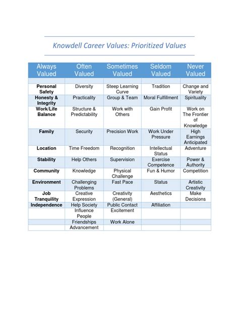 The Knowdell Career Values Card Sort is a self-assessment tool designed to help individuals identify and prioritize their core career values. Developed by Dick Knowdell, this card sort exercise provides a structured way to explore what aspects of a job or work environment are most meaningful to you. Unlike personality tests that focus on traits, the Knowdell card sort hones in on values – the deeply held beliefs and principles that drive your satisfaction and motivation. The card sort typically consists of a set of cards, each representing a different career value, such as achievement, autonomy, creativity, security, and work-life balance. Participants sort these cards based on their personal importance, ultimately ranking them from most to least valued. By clarifying your career values, you gain valuable insights into what you need in a job to feel engaged, satisfied, and successful. This understanding can guide you in making informed decisions about career paths, job opportunities, and even workplace adjustments. Whether you are a student exploring career options, a professional considering a career change, or simply someone seeking greater job satisfaction, the Knowdell Career Values Card Sort can provide a powerful framework for self-discovery and career planning. The process of sorting the cards encourages thoughtful reflection on what truly matters to you in your professional life, helping you align your career with your values and aspirations. It’s a practical and insightful tool that empowers you to take control of your career journey and create a more meaningful and fulfilling work life. So, if you’re ready to uncover your core career values and unlock your career potential, the Knowdell Career Values Card Sort is a great place to start. Remember, understanding your values is the first step towards building a career that truly resonates with who you are and what you care about.