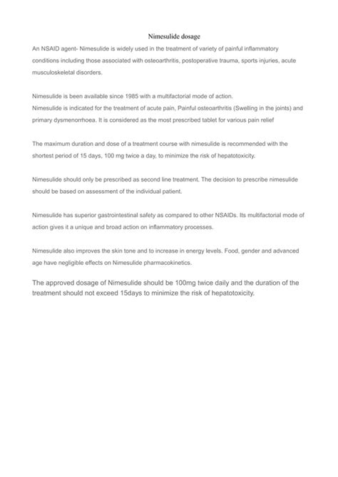 So, to recap, when your doctor prescribes Nimesulide , they’re essentially giving you a powerful ally to combat those annoying aches, swelling, and discomforts by targeting the root cause of the inflammatory response. It’s a fantastic option for short-term relief in many scenarios, but like any medication, knowing how and when to use it safely is absolutely paramount. Understanding its mechanism of action helps us appreciate why adherence to dosage frequency is so important to maintain its therapeutic effect and minimize risks. Remember, while it’s great at what it does, it’s not a magic bullet and comes with responsibilities for safe use. This foundation will help us better grasp why sticking to the recommended schedule for Nimesulide administration is non-negotiable for your well-being. It’s truly a game-changer for many conditions involving pain and inflammation, but only when used correctly and under professional guidance. The benefit-risk profile of Nimesulide is carefully weighed by healthcare professionals, who consider factors unique to each patient before prescribing. This ensures that you receive the most appropriate and safest treatment for your specific needs, emphasizing the importance of a detailed consultation with your doctor before starting or continuing any course of Nimesulide.