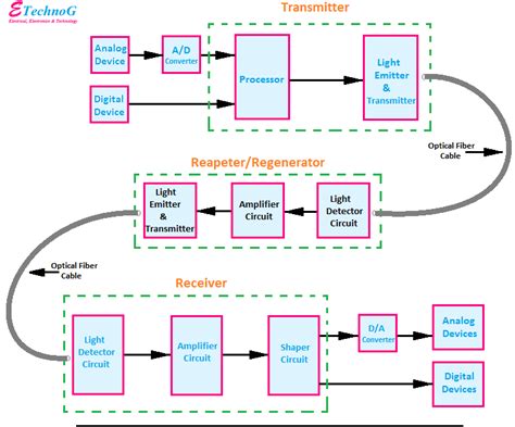 The optical fiber communication system can be broken down into several key components, each playing a crucial role in transmitting information via light. Let’s walk through each part of the block diagram to understand how it all works together.