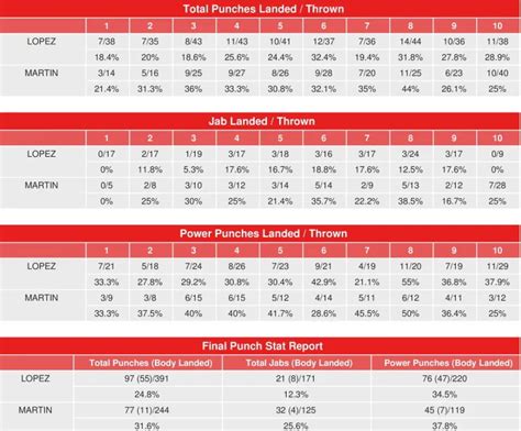 Power punches are the hooks, uppercuts, and overhands that are designed to do significant damage. They are the shots that can knock a fighter out. The power punch stats (punches thrown, landed, and percentage) are important in gauging a fighter’s punching power and ability to inflict damage. In the Sandor Martin vs. Teofimo Lopez fight, the power punch stats are super important. Did one fighter rely on power punches to try to finish the fight, or did they use them strategically? This reveals which boxer was able to land the more impactful shots. It can also tell us how well each fighter was able to create openings. High power punch stats can be a sign of a more aggressive and exciting style, and they’re also a key indicator of a fighter’s knockout potential. This offers insights into each fighter’s ability to finish the fight. This will highlight which fighter landed the more impactful shots. Understanding the power punch stats is crucial in any fight analysis. It shows which fighter had the upper hand in terms of damage dealt. Did Teofimo Lopez land more power punches? Did Sandor Martin show a better connect percentage? These are great questions to ask.