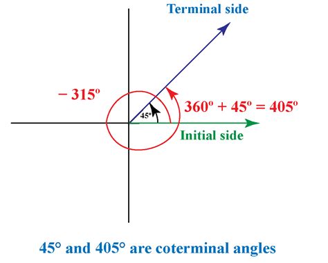 Now that we’ve mastered the terminal side concept, let’s talk about something closely related: coterminal angles . Guys, coterminal angles are angles that share the same terminal side. In other words, they start at the same initial side and end at the same terminal side, but they might have different amounts of rotation. Think of it like running laps around a track: you might run one lap, two laps, or even ten laps, but you always end up at the same finish line. In mathematical terms, coterminal angles differ by a multiple of 360 degrees (or 2π radians).