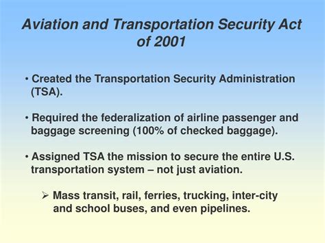 Hey guys! Let’s dive into something super important for anyone who flies or works in the aviation industry: the Aviation Transportation and Security Act . This landmark piece of legislation, often just called ATSSA, was signed into law back in 2001. You’ll probably remember that year for a lot of reasons, and this act is definitely one of them. Its main goal was to overhaul and significantly strengthen security measures across the entire U.S. aviation system. Before ATSSA, aviation security was a bit of a patchwork, with varying standards and oversight. The events of 9 11 tragically highlighted the vulnerabilities in this system, making it crystal clear that a comprehensive, federalized approach was desperately needed. This act didn’t just tweak a few things; it fundamentally reshaped how we approach security at airports, on planes, and throughout the entire transportation network. It created new agencies, mandated new technologies, and set new standards for personnel and procedures. Think of it as the foundation upon which modern aviation security is built. It’s a complex piece of legislation, but understanding its core components is crucial for grasping the security landscape we navigate every time we fly. We’re talking about everything from who screens your bags to the types of locks on cockpit doors. It’s a big deal, and its impact is felt by every single passenger, pilot, flight attendant, and airport worker. So, buckle up, because we’re going to break down what this act really means for all of us in the world of air travel. We’ll explore its key provisions, the agencies it created, and the lasting legacy it has left on making our skies safer. This isn’t just dry legal text; it’s about the peace of mind we have when we take to the air. Let’s get into it!