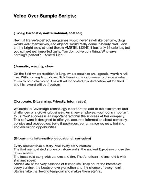 • Versatility: Practice scripts come in all shapes and sizes. You can find scripts for commercials, narrations, character voices, and even video games. This variety allows you to explore different genres and discover your strengths.